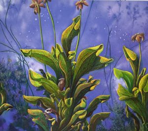 Bogland is an exhibition of works exploring and describing Ireland’s peatlands through its mysterious plants. Walking these wild places between lock-downs, I have discovered myriad colours of sphagnum moss, carnivorous native plants and beautiful alien species that have found ingenious ways to survive this harsh acidic terrain. Described from a unique perspective, the works take an insect’s eye view of this other-worldly habitat.